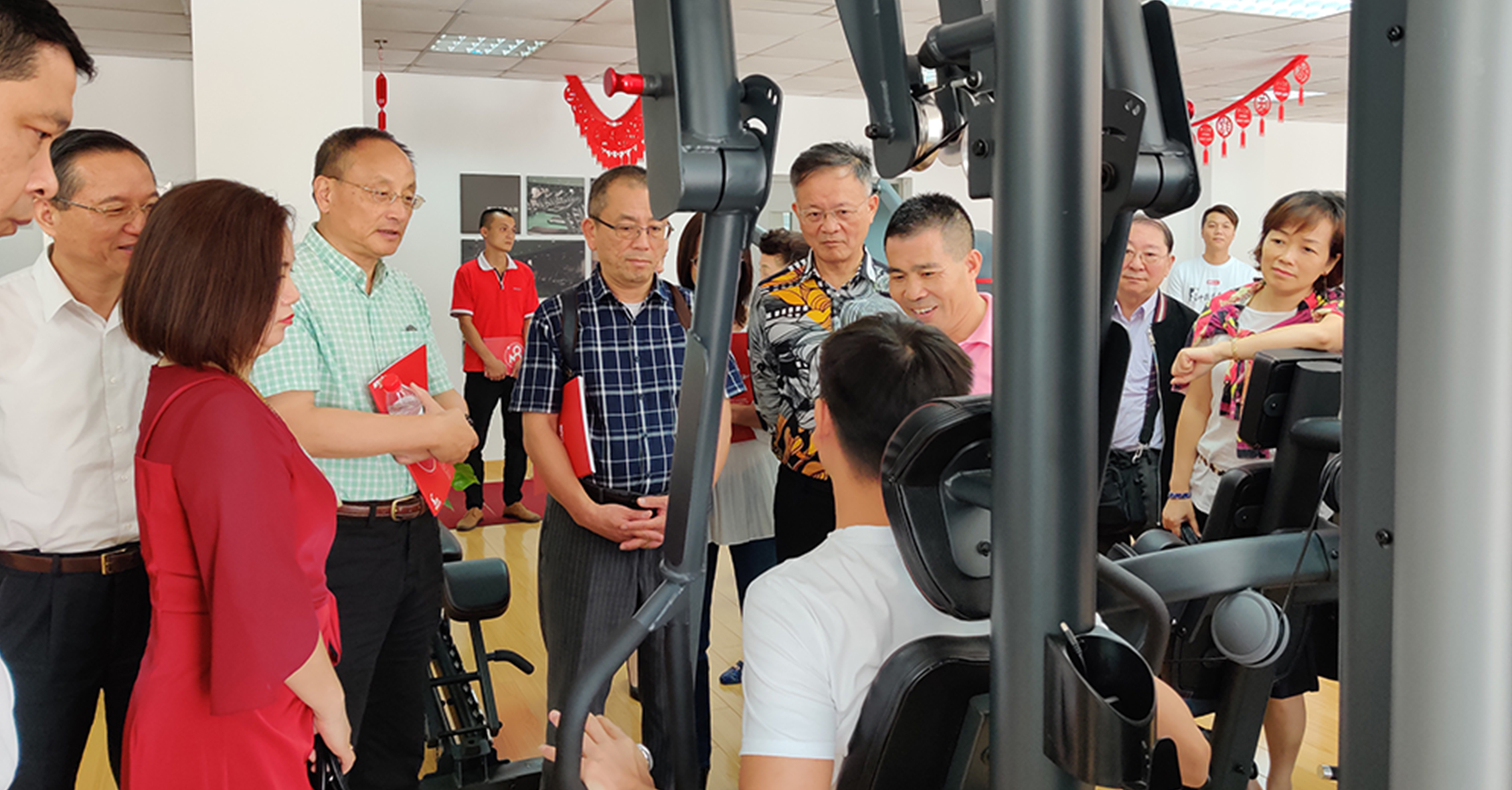 首先,來賓一行參觀考察了jiuyou.com的文化長廊,對我司的發展歷程、企業文化、企業特色等方面進行初步了解。在參觀一樓與負一樓展廳過程中,來賓一行對jiuyou.com種類齊全的健身器材表現出濃厚的興趣。
